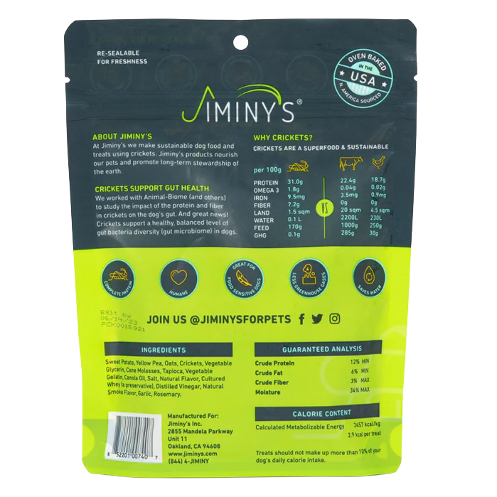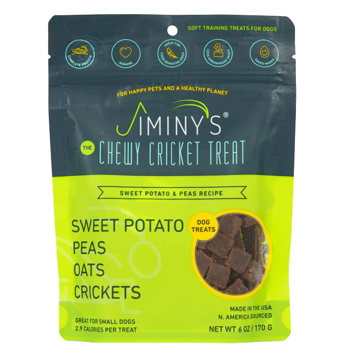 Jiminy’s Sweet Potato and Pea dog treats are soft & chewy containing wholesome ingredients like sweet potato, peas, oats, and crickets for a delicious and nutritious reward. These treats are designed as a training reward, but they are also great for small dogs who prefer a soft, savory treat.