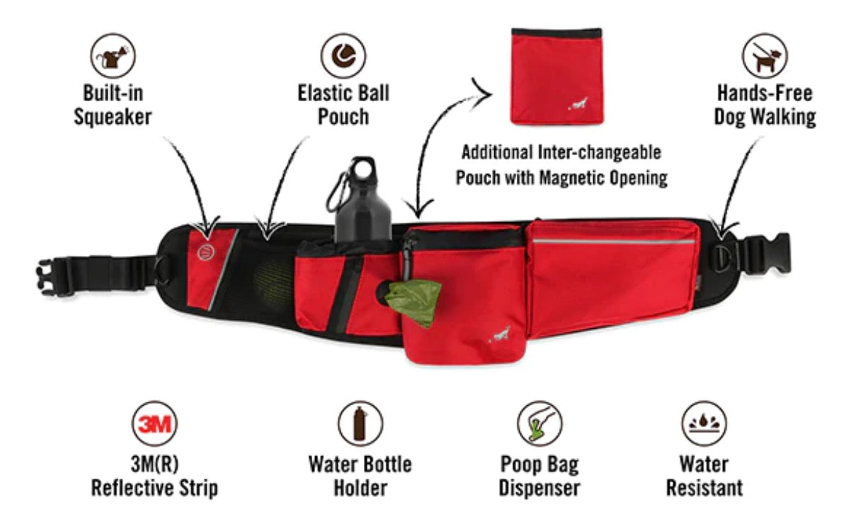 Unleash limitless fun with our all-in-one dog walking belt bag. Designed for convenience, this hands-free Explorer Pack makes outings with your furry friend a breeze. With its multiple zippered pockets, water bottle holder, and reinforced metal D-ring for leash attachment, you'll have everything you need at your fingertips. Plus, our detachable and washable treat pouch keeps your pup's favorite treats close by!