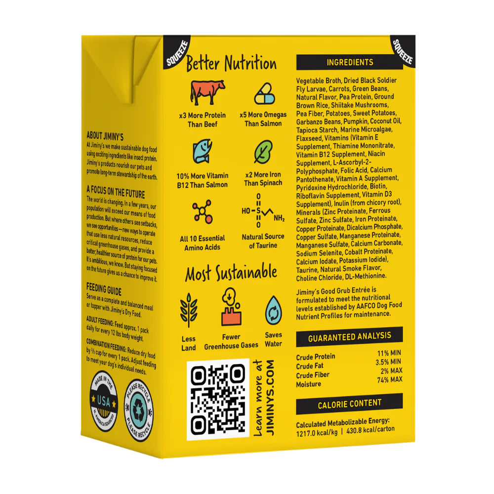 Jiminy's Good Grub Entree is a complete and balanced meal for your dog but it can also be used as a topper to entice a picky eater. Made with an alternative protein – insect protein (BSFL) - it’s great for dogs with allergies or food sensitivities. Best of all, it’s an eco-friendly choice for your dog. Our grubs use less land and water to produce than traditional protein - it even comes in a recyclable tetra pack!